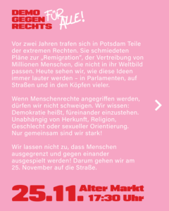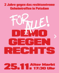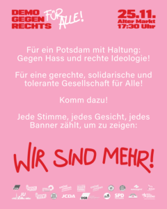 Aktionen Allgemein Slider Aufruf Demonstration „Demo gegen rechts – Für alle!“ 25.11.2025 – Alter Markt, Potsdam Service 15. November 2025 15. November 2025 Das Bündnis Potsdam!bekennt Farbe ruft zur „Demo gegen rechts – Für alle! 2 Jahre gegen das rechtsextreme Geheimtreffen in Potsdam“ auf: